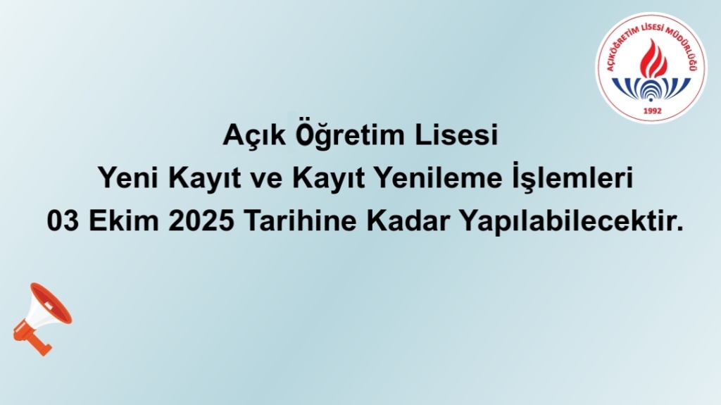 Açık Öğretim Lisesi Yeni Kayıt ve Kayıt Yenileme İşlemleri 03 Ekim 2025 Tarihine Kadar Yapılabilecektir.